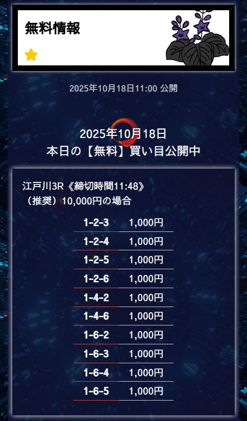’25/10/06 的中無料予想で28,300円の払い戻しを獲得