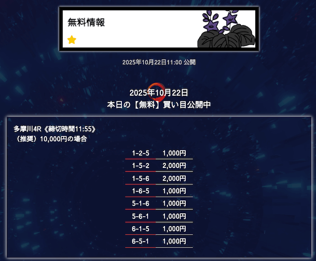 ’25/10/22 的中無料予想で13,800円の払い戻しを獲得