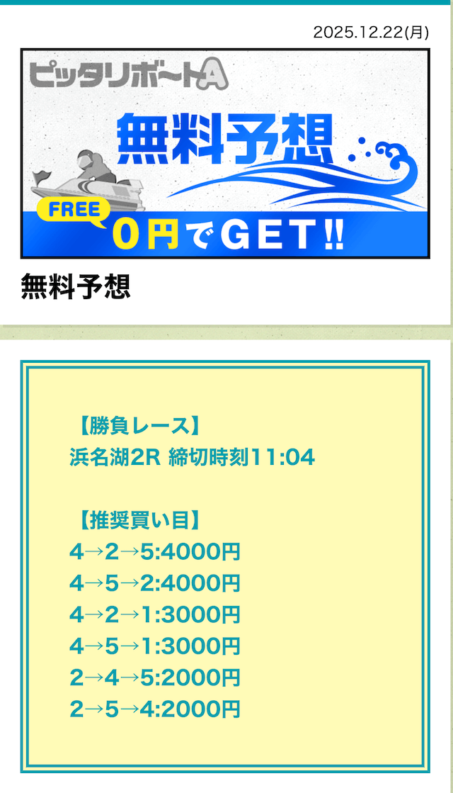 ★★★★★ 5.02025/05/28最初は「どうせ情報商材系やろ?」って思って軽くスルーしてた。けどTwitterでやたら話題になってて、試しに登録してみたらマジで予想当たって草。5点予想で2レース連続的中とか、久々に鳥肌立った。下手なYouTuber予想より100倍マシやで。今月だけで7万プラス、しかも平日でな。