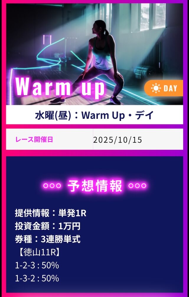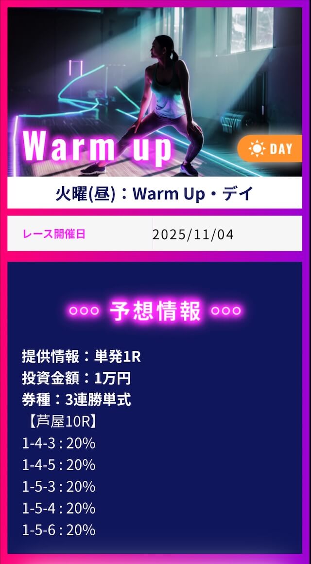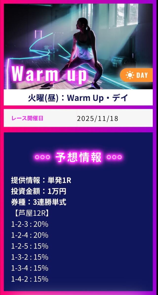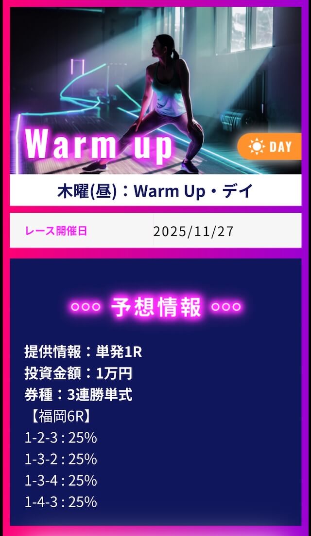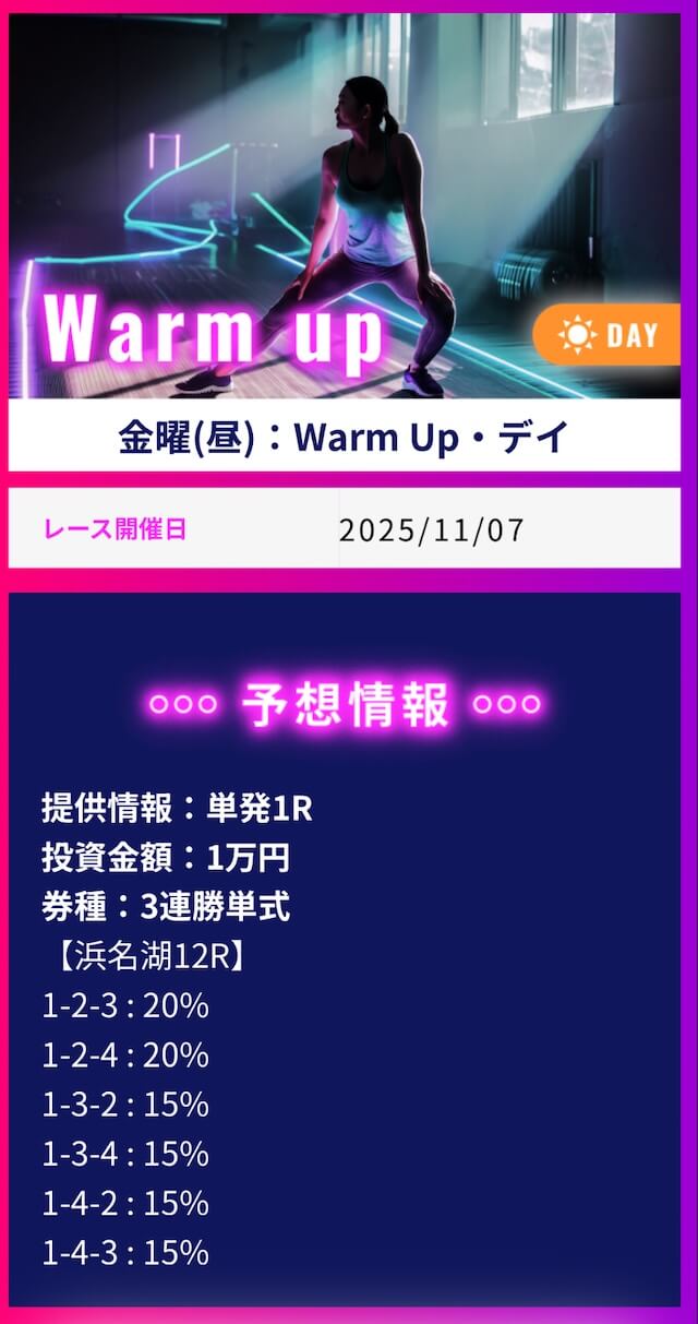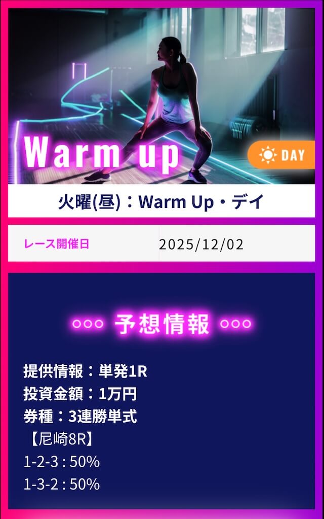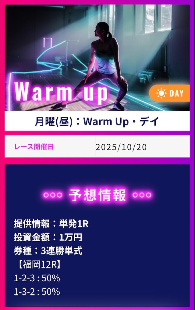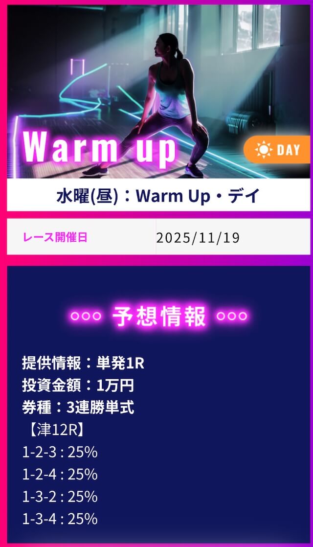 ワークアウトでは1番お高いプランに参加して不的中だった場合に保証発生、翌日にもう一度無償で参加出来るみたいです。