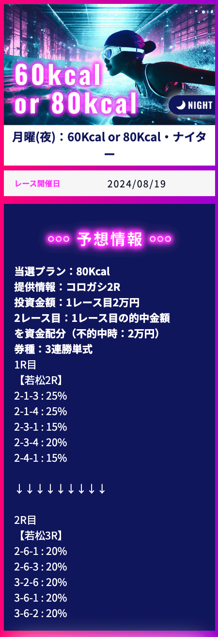 | 60kcal or 80kcal | 6戦6勝0敗 | 100% | 838% | 120,000円 | 360,000円 | 4,022,350円 | +3,542,350円 |