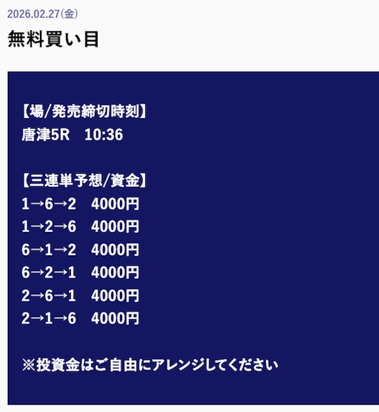 ’26/02/10 的中無料予想で36,800円獲得