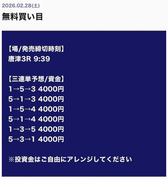 ’26/02/26 的中無料予想で42,800円獲得