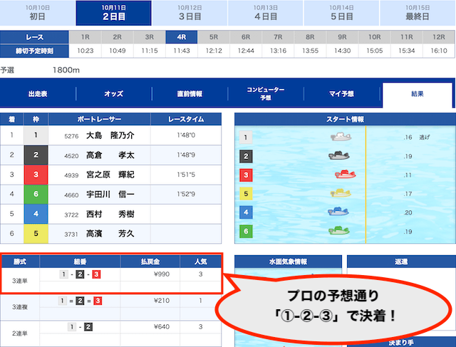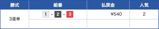 上記買い目では「1-2-3」の舟券代が最も高くなっており、プロも「1-2-3」になる可能性が高いと予想してることがわかります。