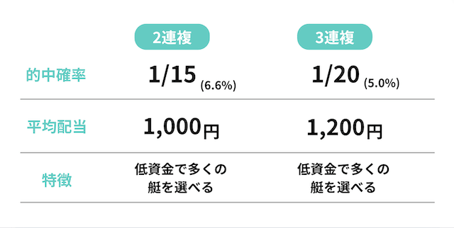2連複や3連複の場合「艇を2〜3艇選ぶから当たりにくいのでは…」と思われる方もいるかもしれませんが、意外と当たりやすいです。
