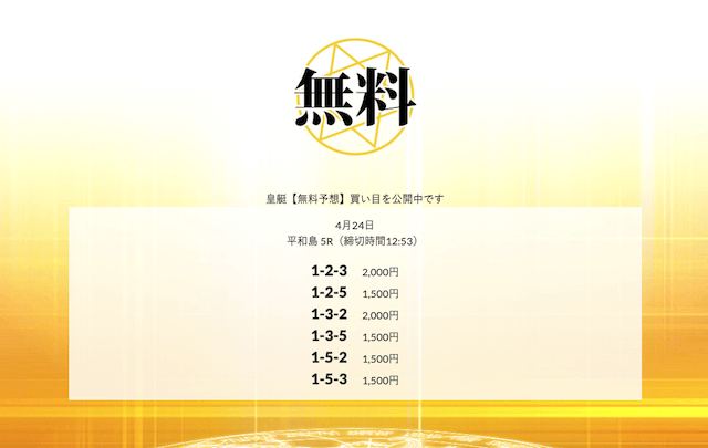 - Q:無料予想ってどれくらい使えば稼げますか?A:皇艇は的中率・回収率共に抜群なので、1ヶ月も使い続ければ満足できる金額になるでしょう。