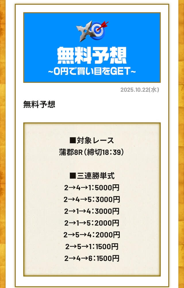 ’25/10/22 的中無料予想で24,900円獲得