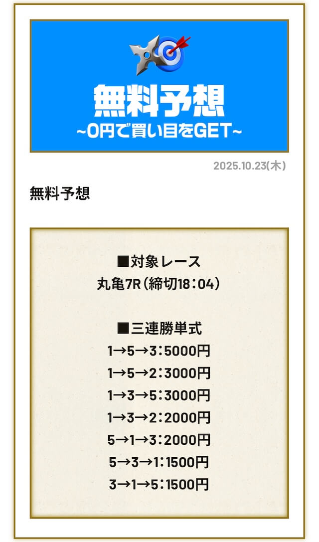 ’25/10/30 的中無料予想で18,000円獲得