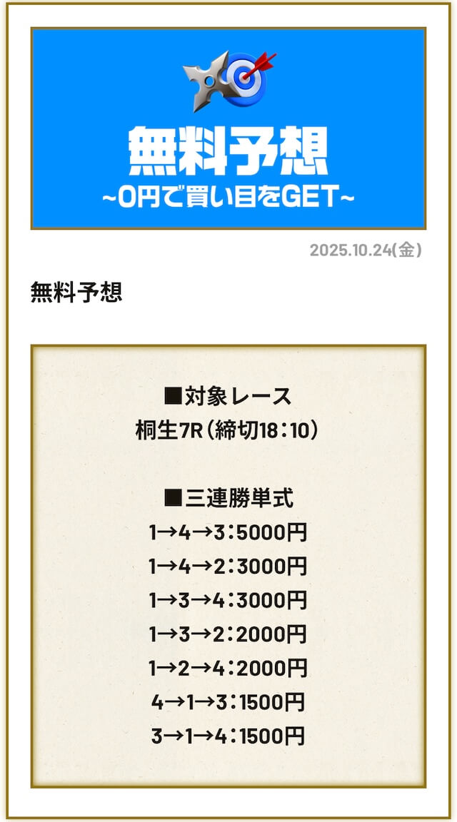 ’25/10/15 的中無料予想で33,800円獲得