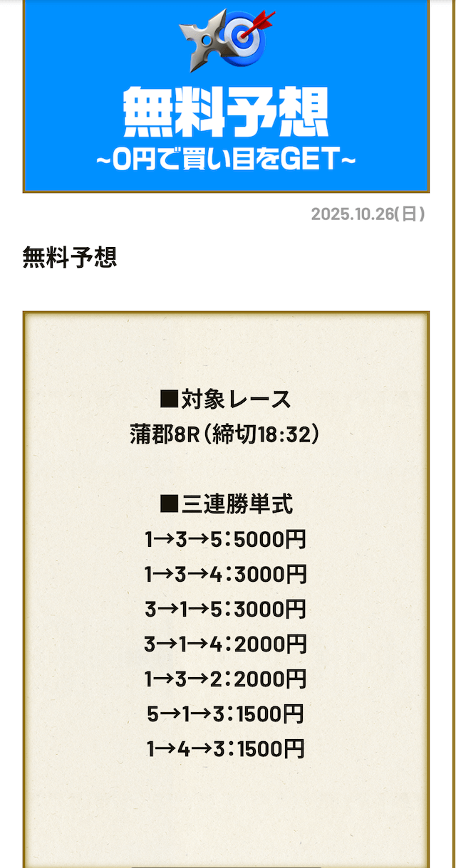 ’25/10/26 的中無料予想で45,300円獲得