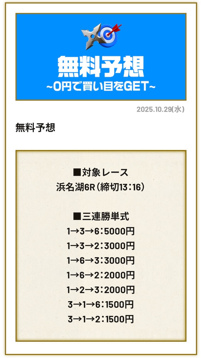 ’25/10/11 的中無料予想で49,500円獲得