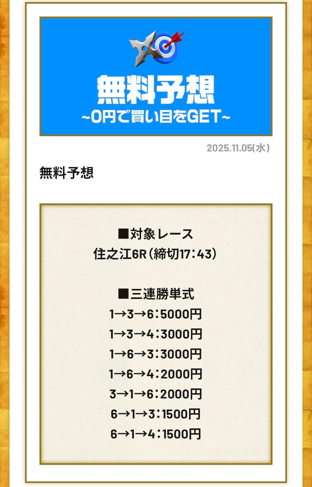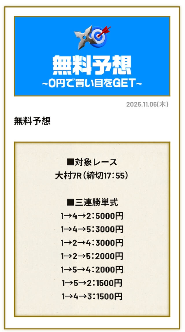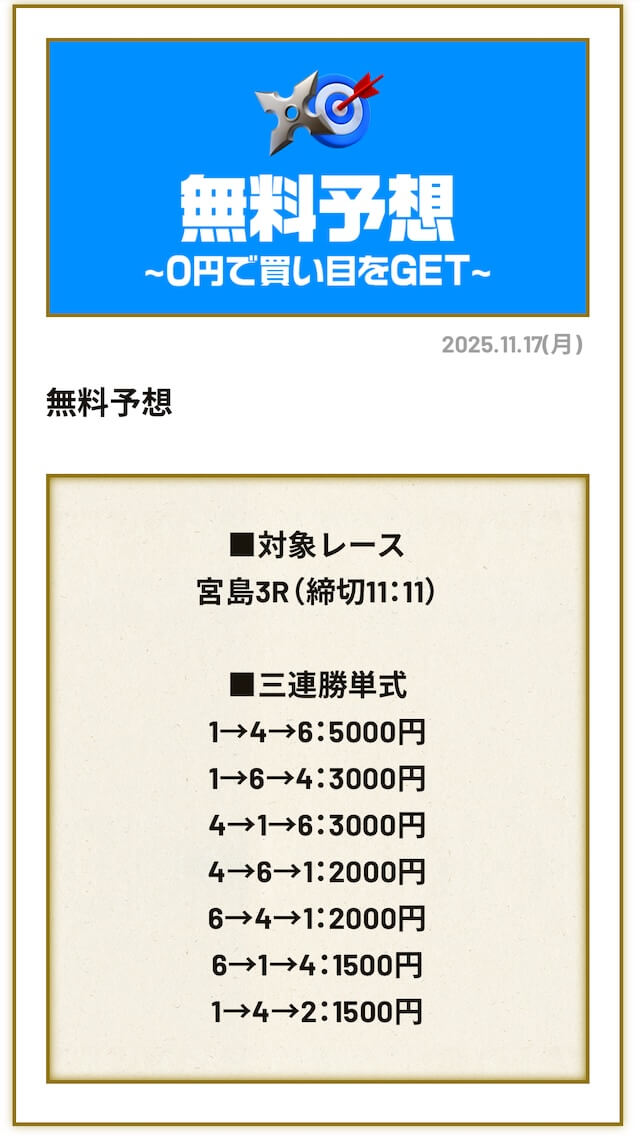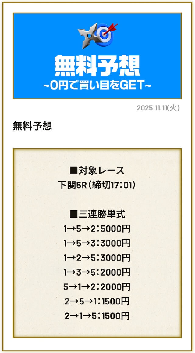 ’25/11/12 的中無料予想で25,500円獲得
