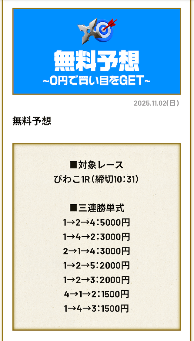’25/11/04 的中無料予想で25,200円獲得