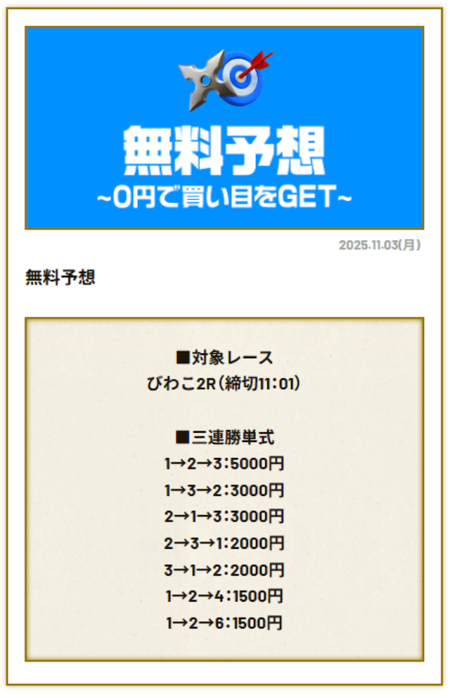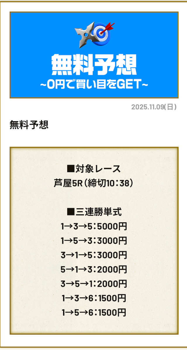 ’25/11/10 的中無料予想で35,400円獲得