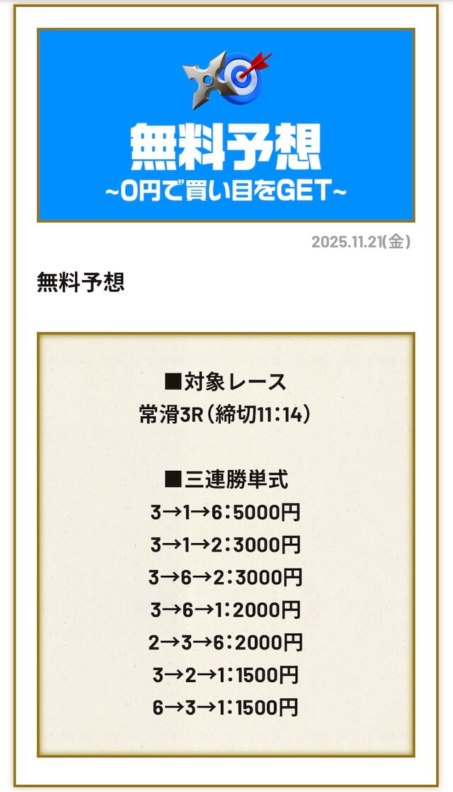 ’25/11/21 的中無料予想で69,500円獲得
