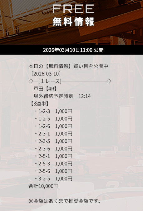担当の対応もいいし、無料予想も意外とちゃんとしてるので期待してます。登録しておいて損はないかな。 - 2026/03/07