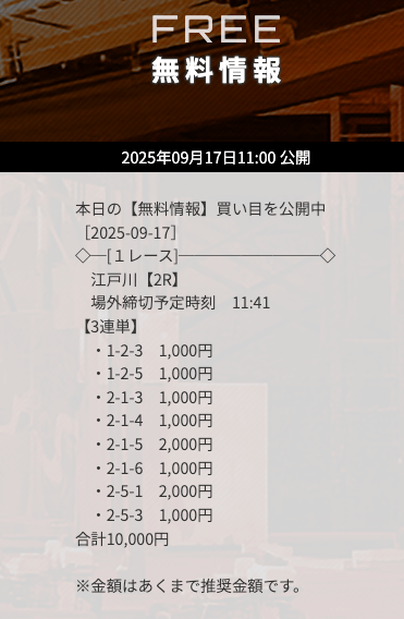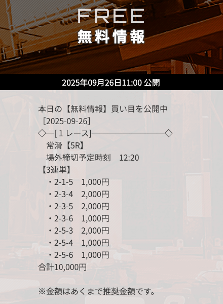 ’25/09/08 的中無料予想で26,850円の払い戻しを獲得
