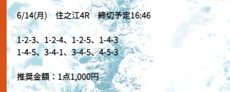 競艇道の有料プランの中では最も安価なので、情報料金の高いプランと比べると情報の質は低くそこまで期待できないかもしれませんが、予想が当たれば最低でも28,000円以上の利益が見込めると考えたら悪くはありません。