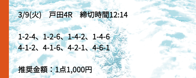 券種は①号艇と③号艇を1着に固定3連単のフォーメーションで買い目は8点。