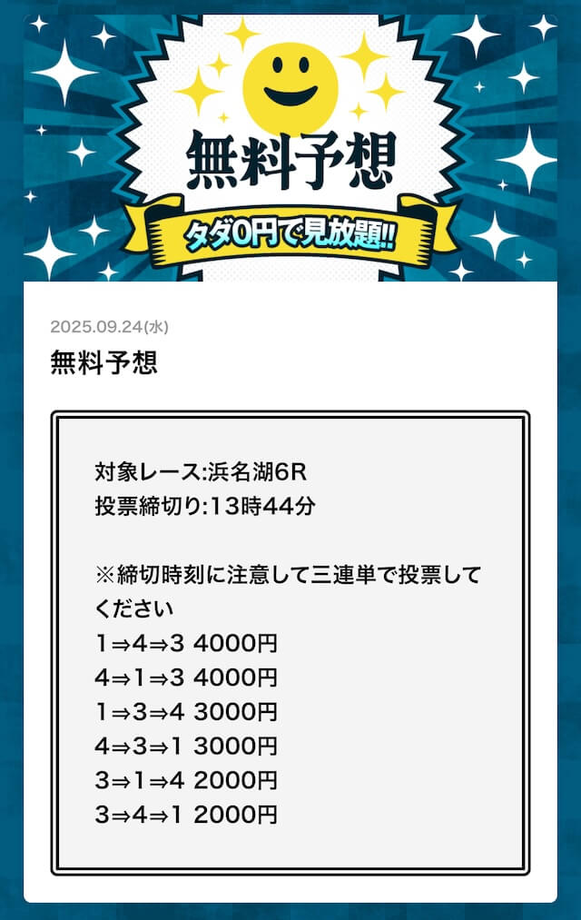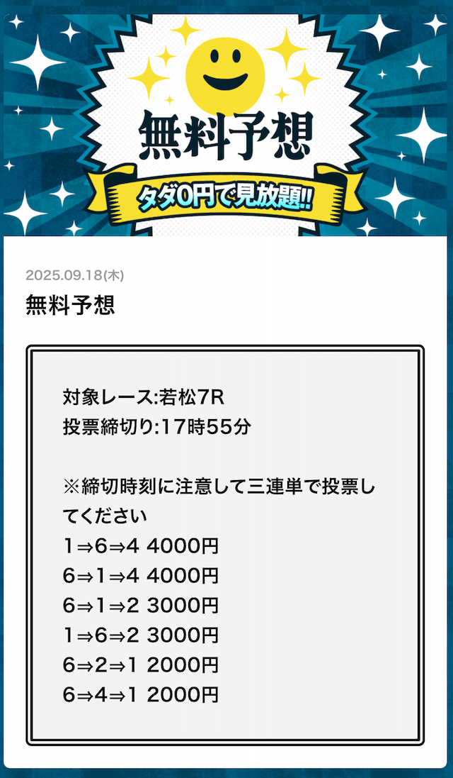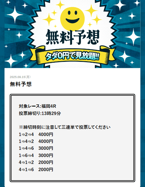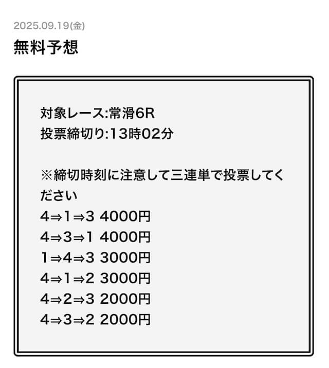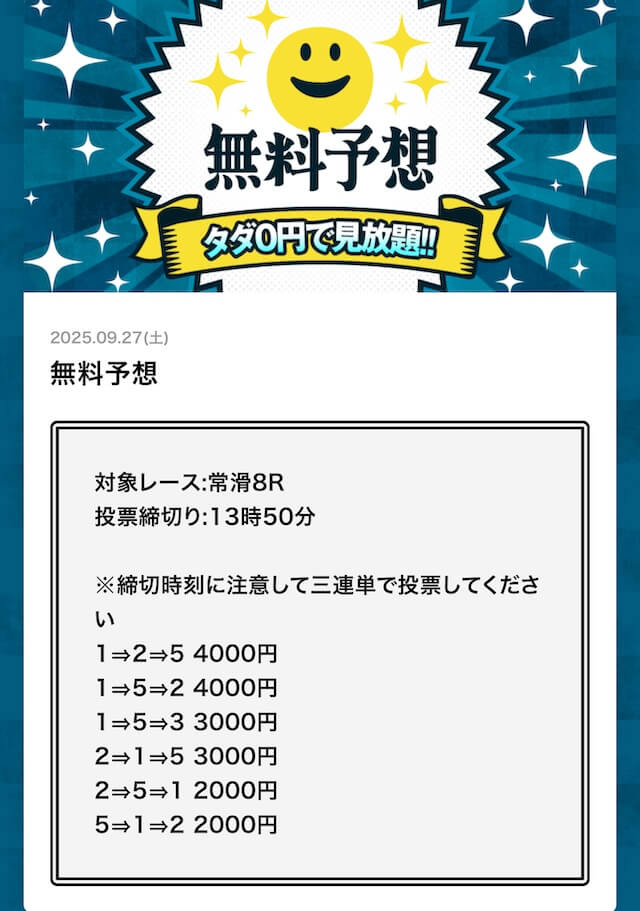 ’25/09/12 的中無料予想で45,700円獲得