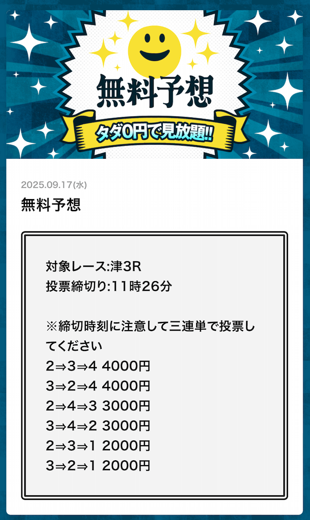 ’25/08/06 的中無料予想で17,400円獲得