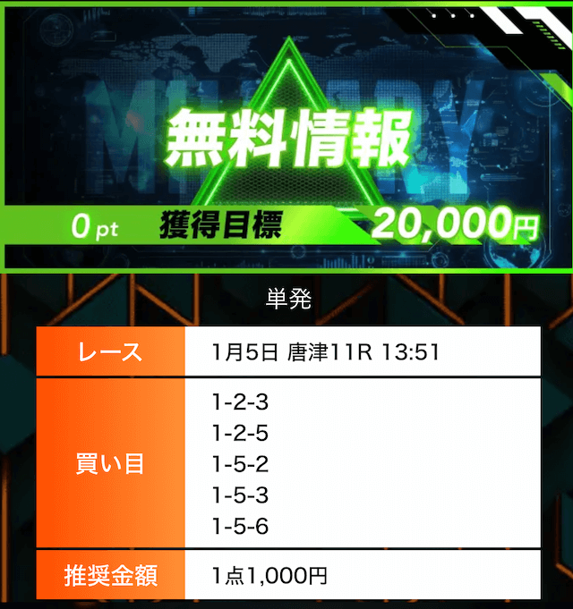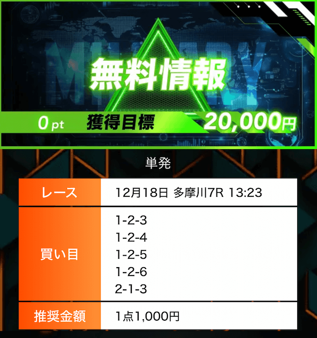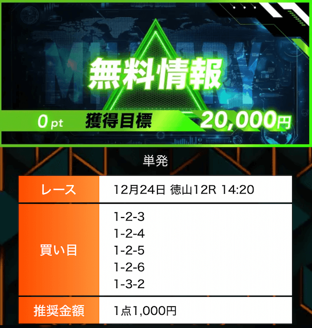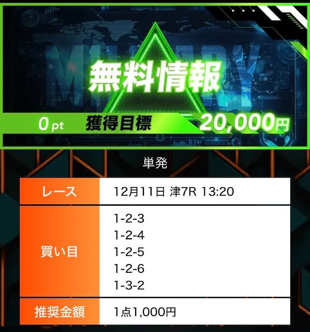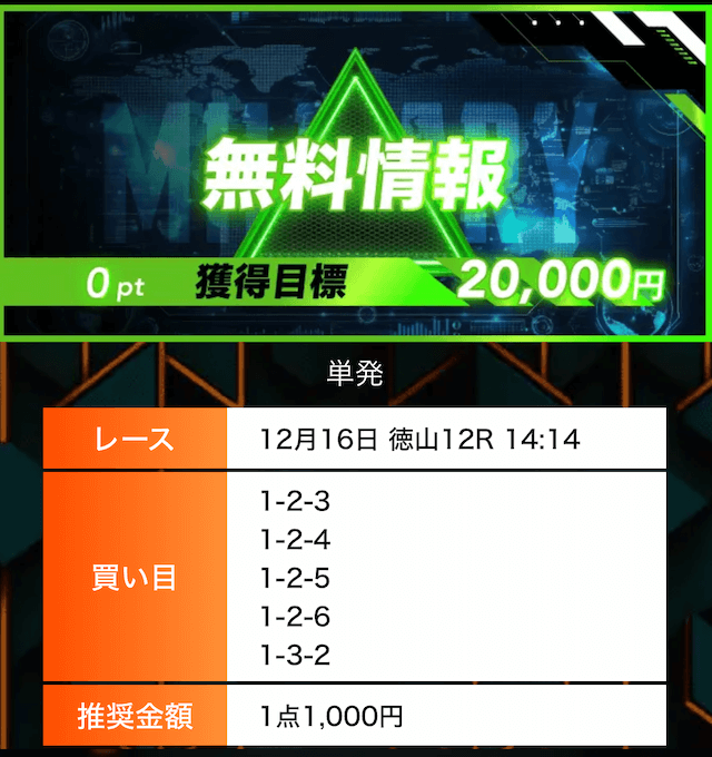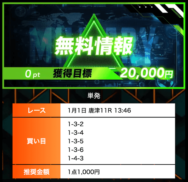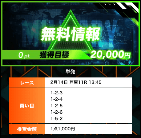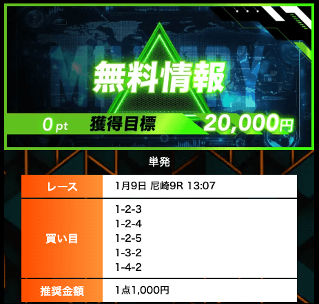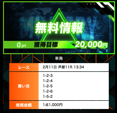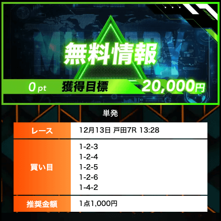 ★★★★★ 5.02025/09/02最初は半信半疑でしたが、無料情報でもしっかりプラス収支になりました。精度が高く、他のサイトよりも堅実に稼げている印象です。