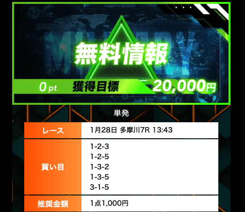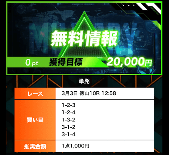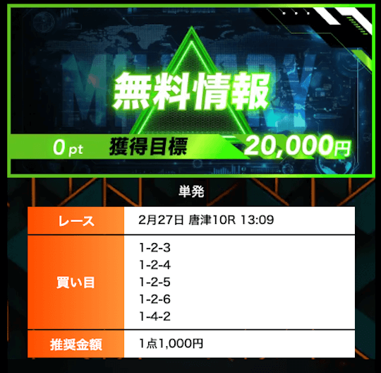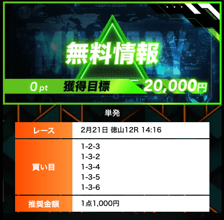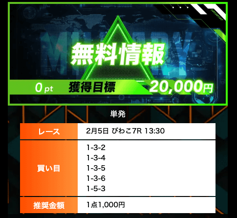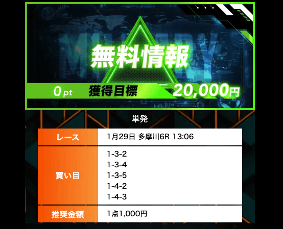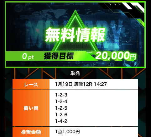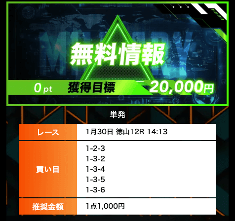 登録してすぐに提供された無料情報が外れ。不安を感じ他ので、もう少し安定した成績が出てから使い続けたいです。