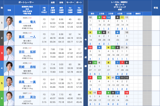 優勝戦も同様、準優勝戦で良い結果を残した選手ほど好枠で出走できます。