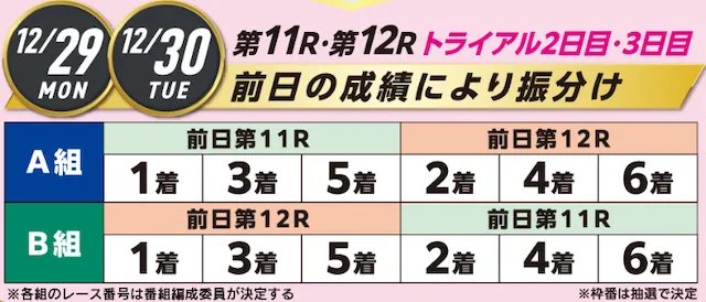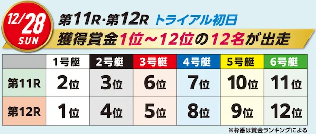 競艇グランプリとは異なり、トライアル初日から賞金ランキング1位~12位の12名が出走します。