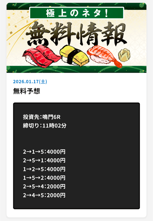 ’26/01/04 的中無料予想で34,400円獲得