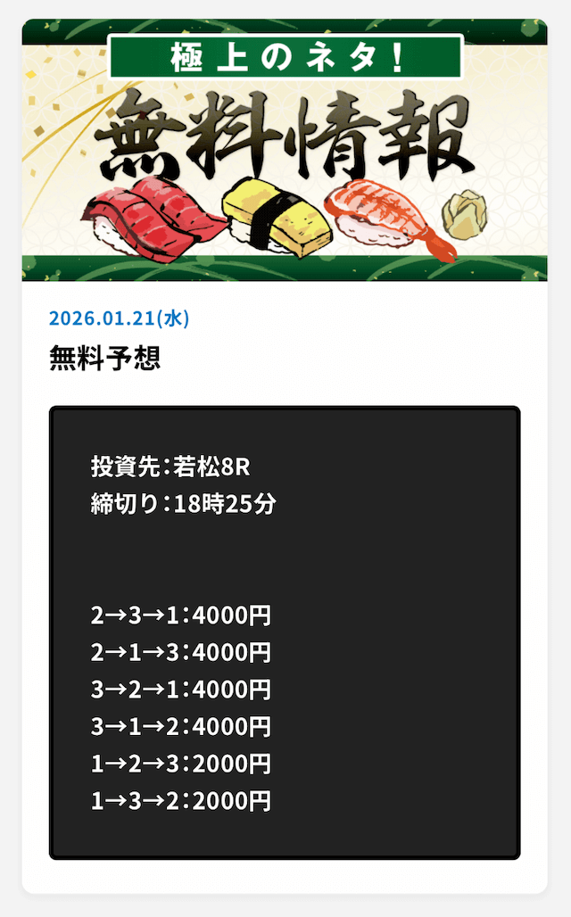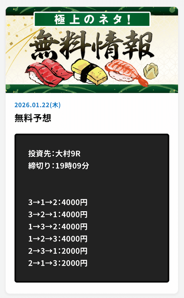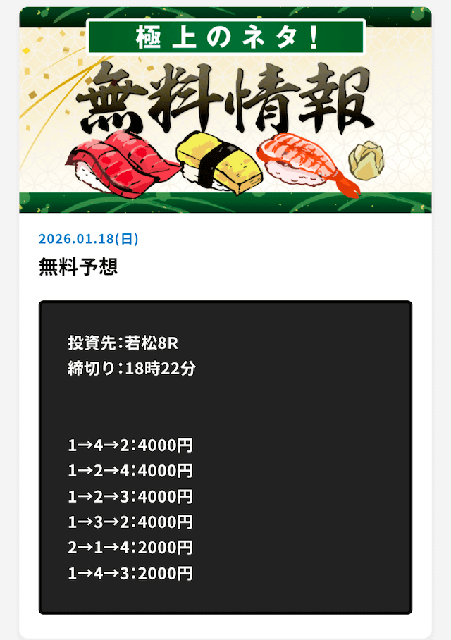 ’26/01/08 的中無料予想で30,000円獲得