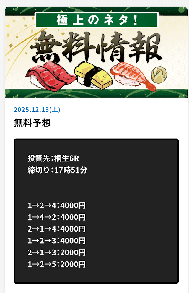 ’25/12/11 的中無料予想で67,200円獲得