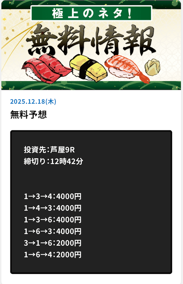 ’25/12/08 的中無料予想で58,000円獲得