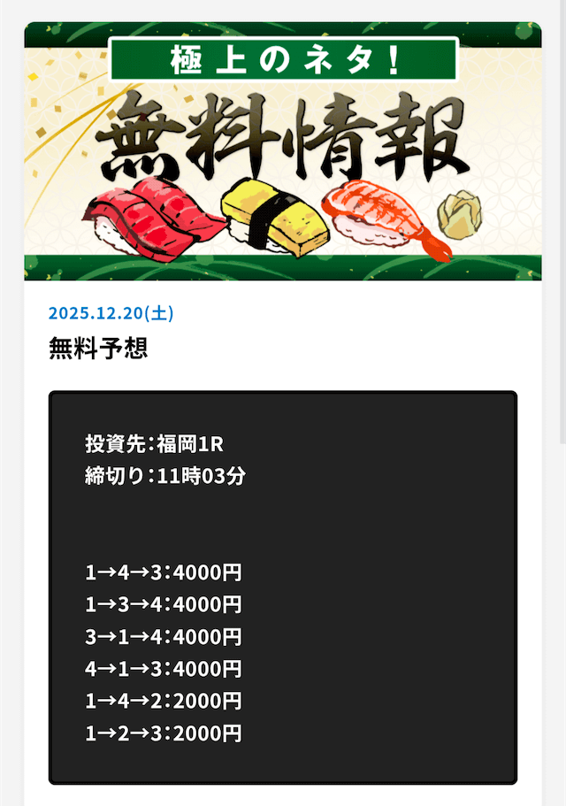 ’25/11/14 的中無料予想で25,600円獲得