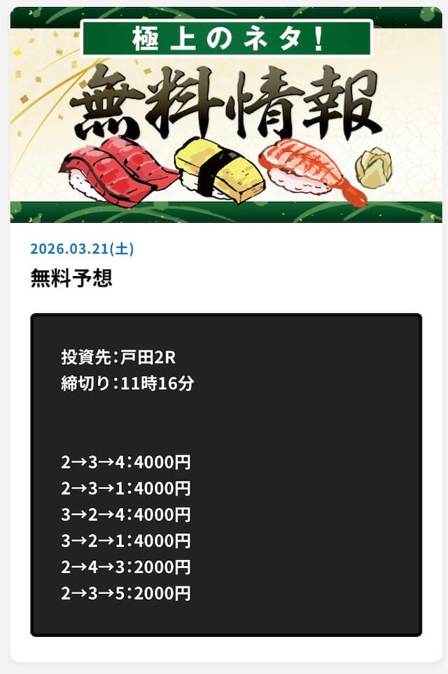 ’26/03/11 的中無料予想で25,400円獲得