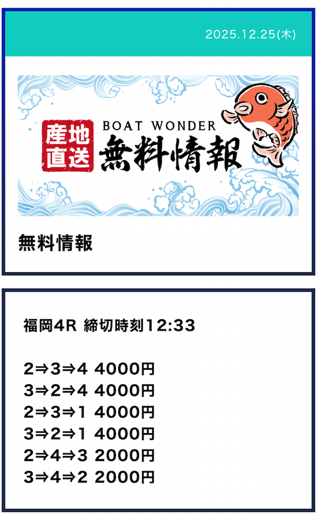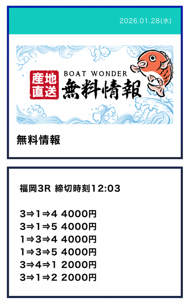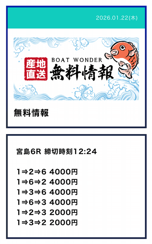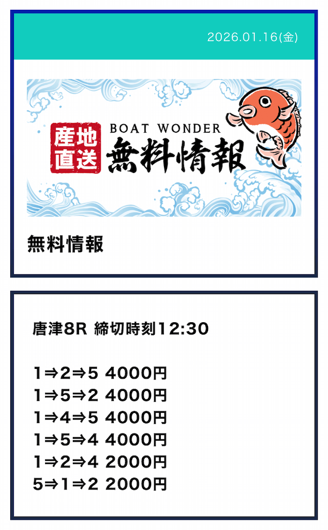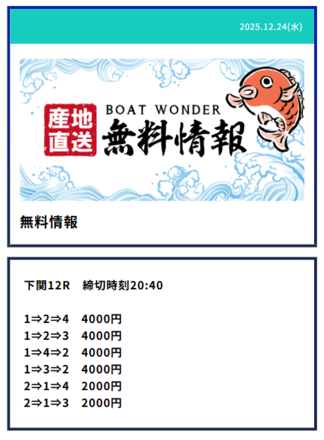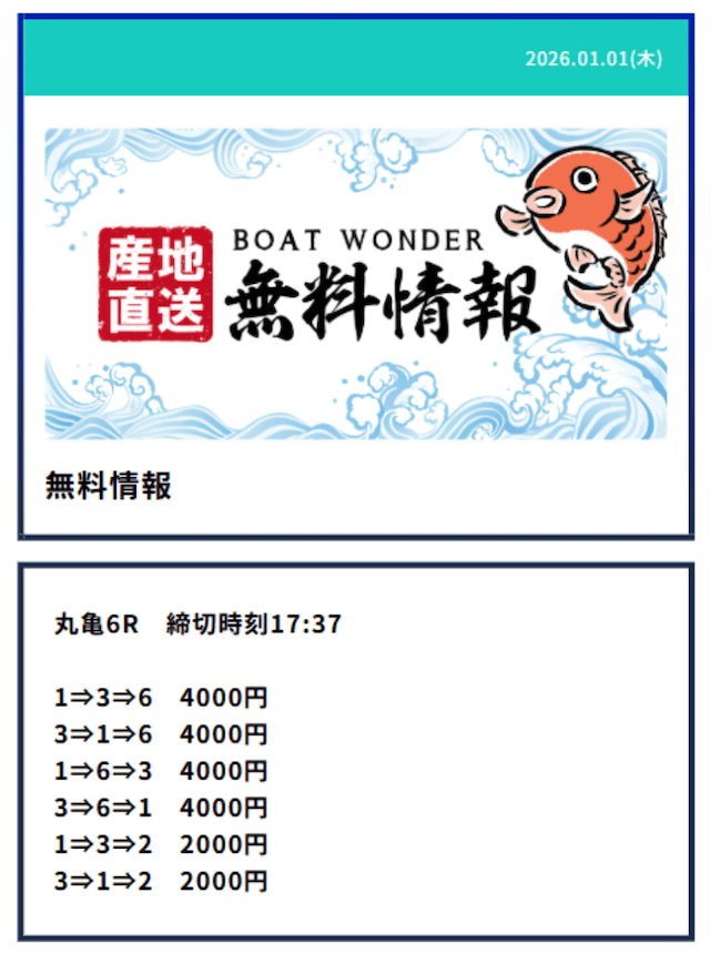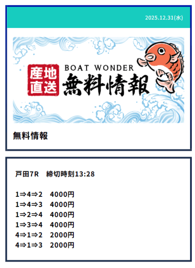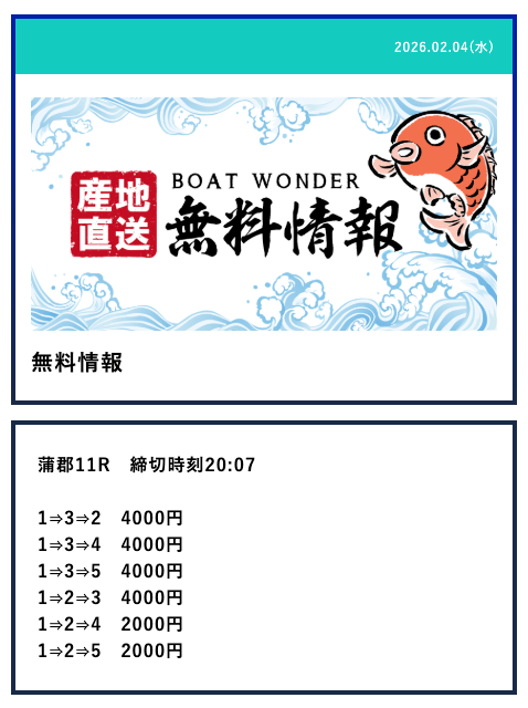- Q2無料予想は毎日提供されるの?予想が公開される時間は?Aボートワンダーの無料予想は火曜日と水曜日を除いた、週5日提供となっていました。提供数は1日2レースで、提供時間はデイ9:10/ナイター15:10となっていました。