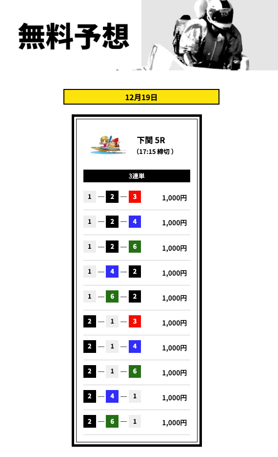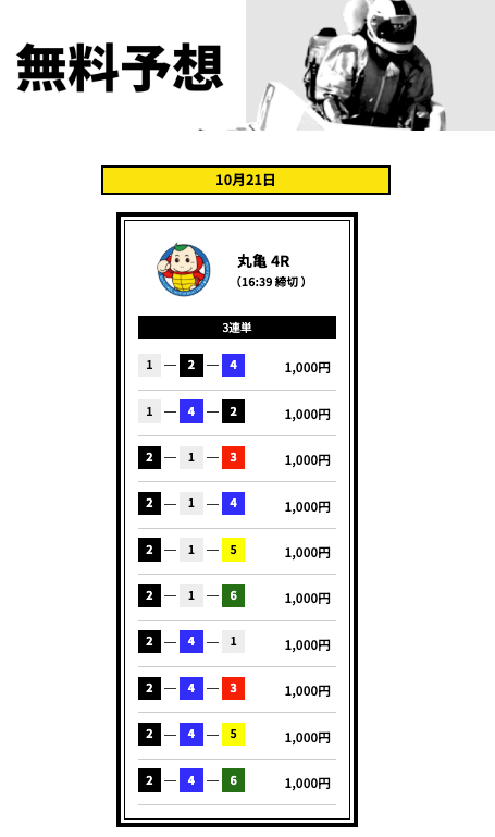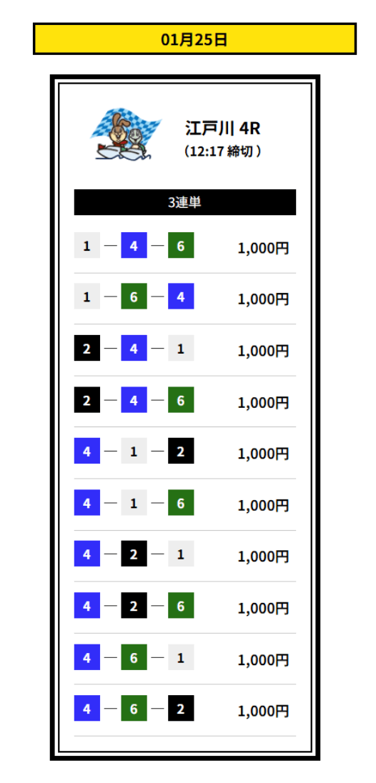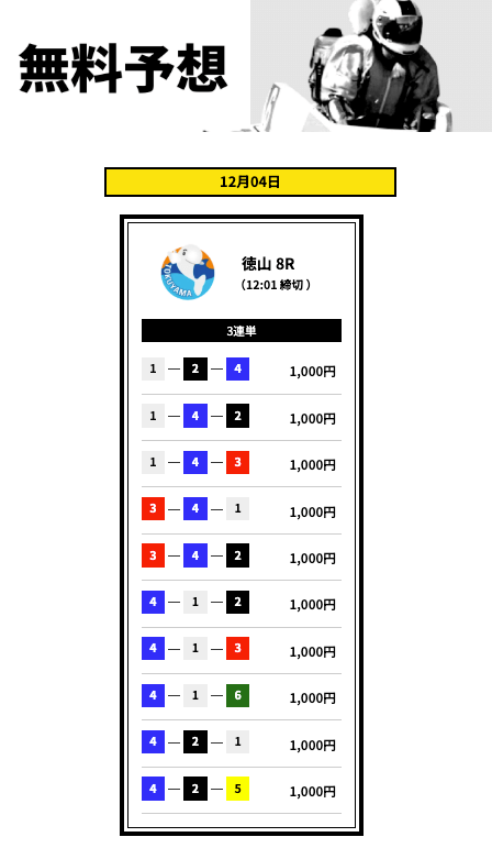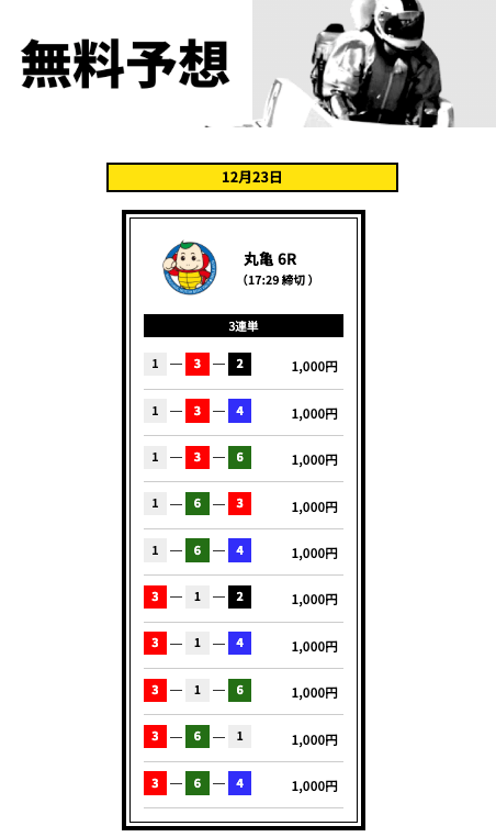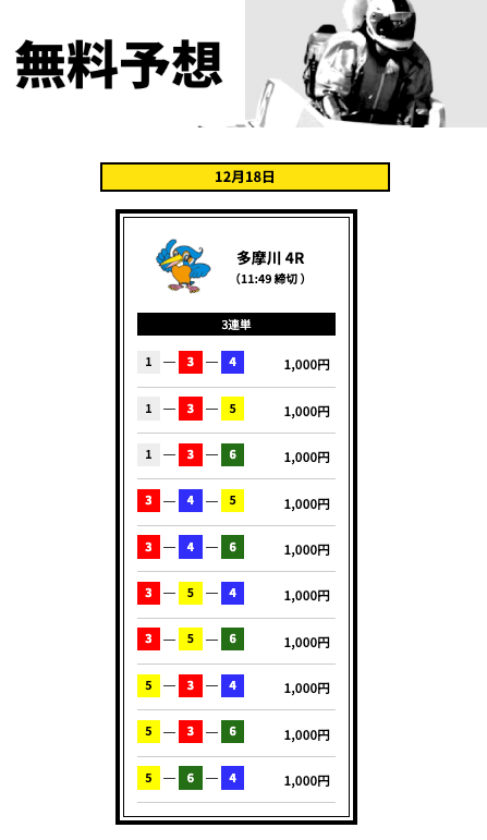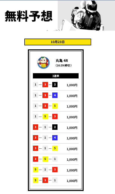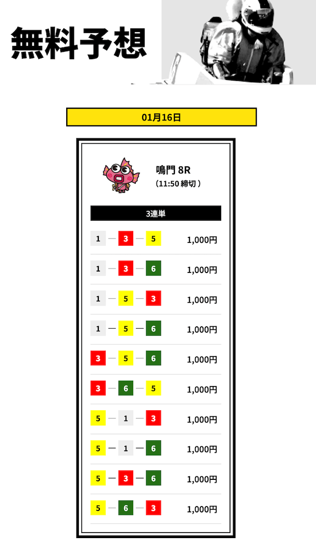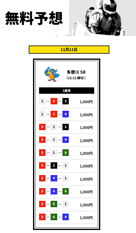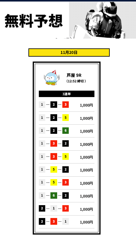 買い目数がレースに合わせて変わるのは資金管理の面でありがたい。外れた日は正直イラっとするけど、根拠のある予想だから納得して楽しめます。無料も有料も使いやすく、ちょっとした息抜きとして続けています。