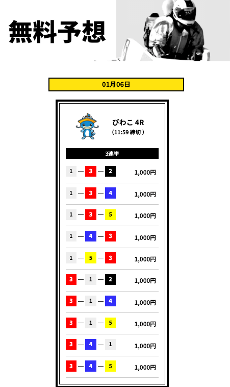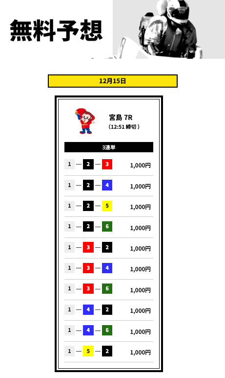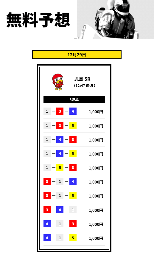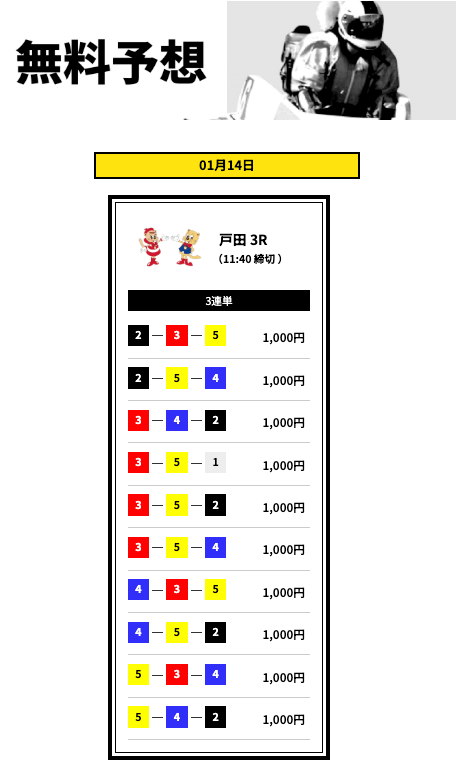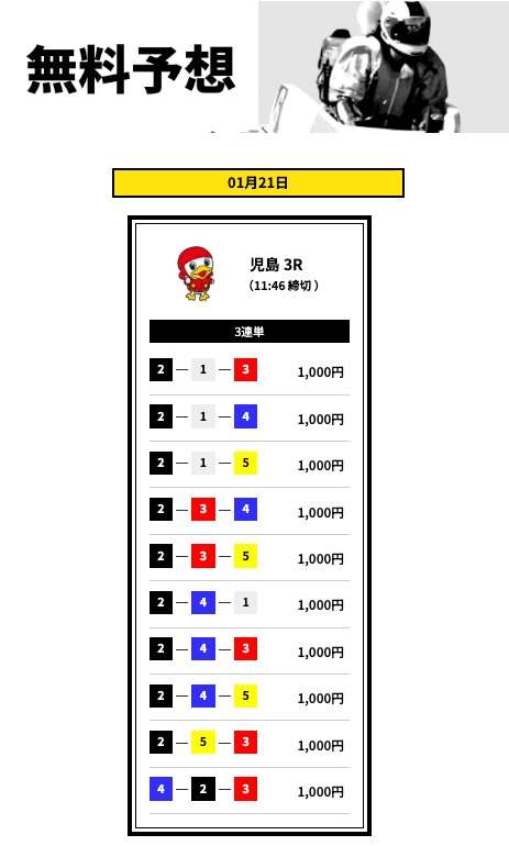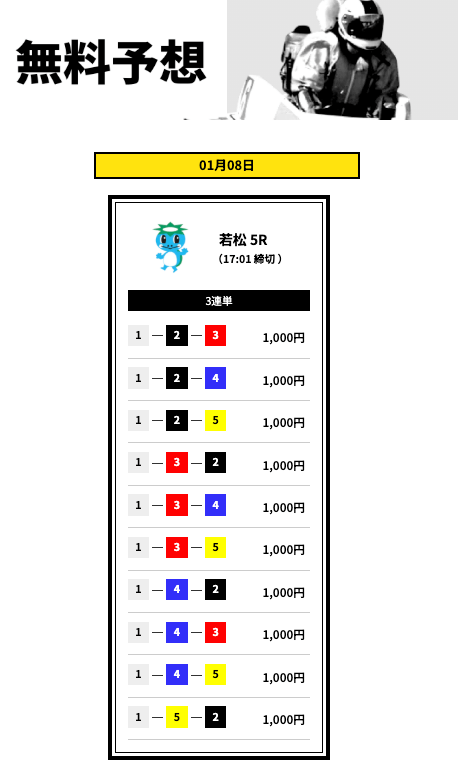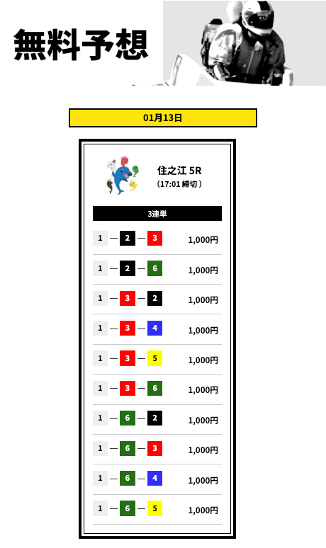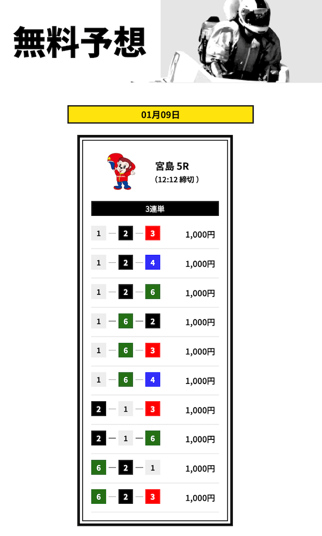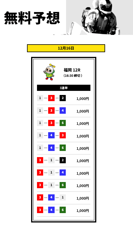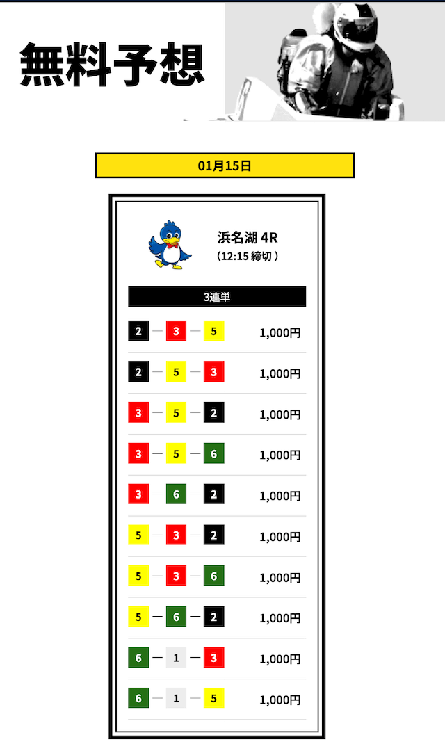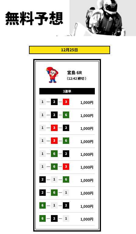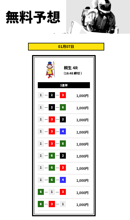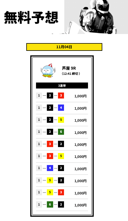 無料予想2レース分、意外に当たったからニヤリ。初回補償があるから安心して使えるし、最近はかなりハマってる。これからどうなるか楽しみだな。