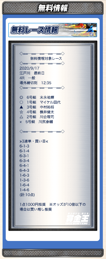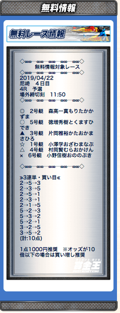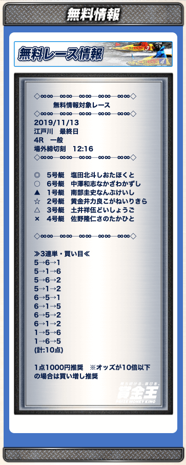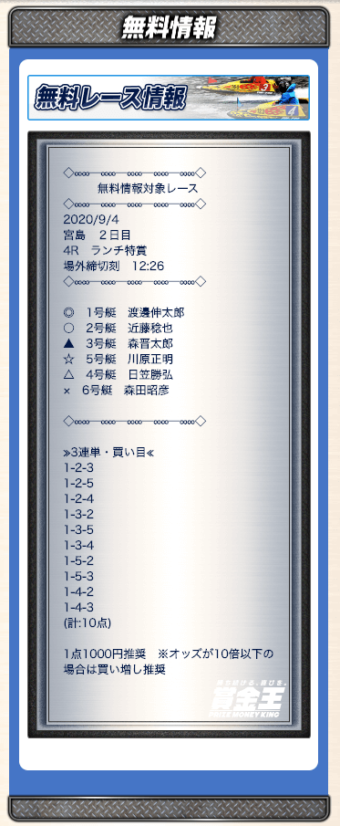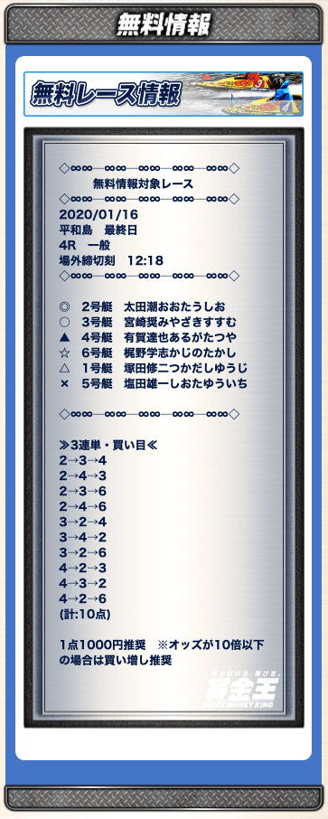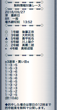 登録は無料ですし無料情報の配信回数も高いので、競艇で勝負するのであれば、みなさまもチェックしておくことをオススメします。