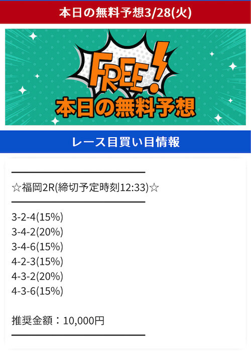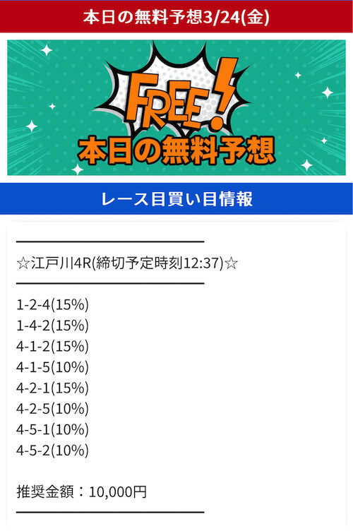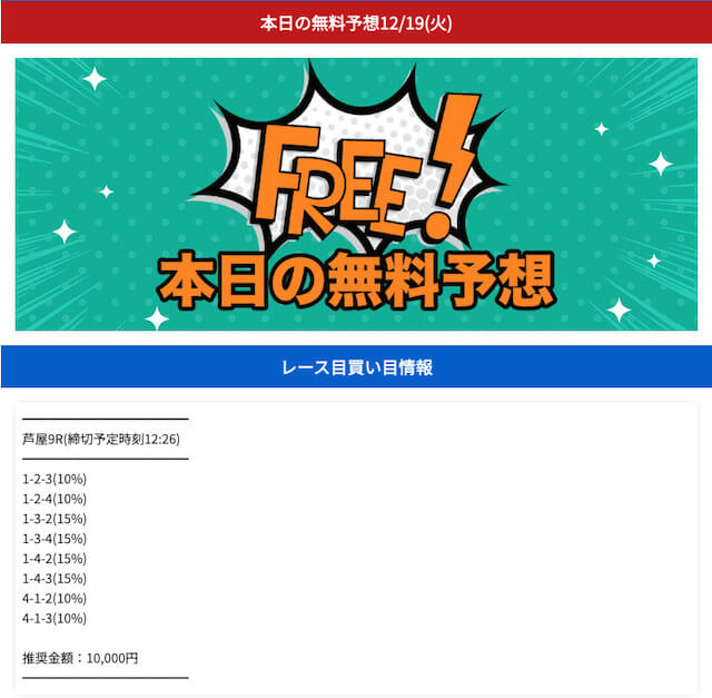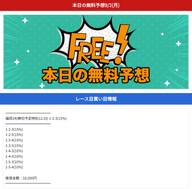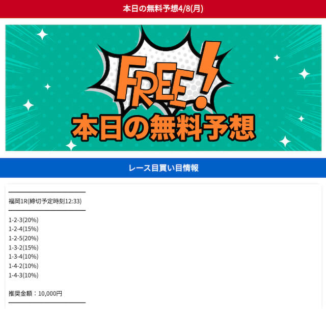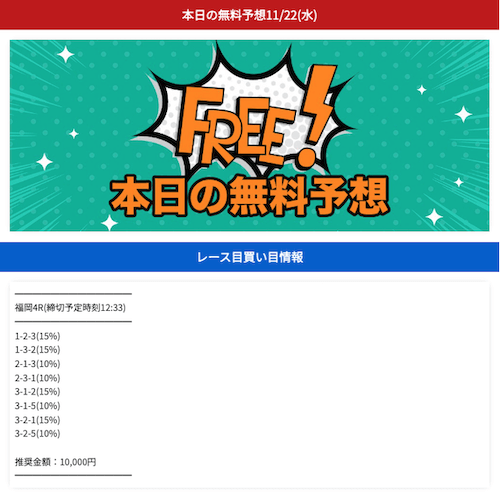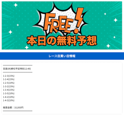 無料予想は結構堅めなレース選んでるんだけど、利益が出るようにしっかり資金配分・買い目精査されてるから、的中率と回収率どっちも素晴らしい。10戦参加で8勝で18万円ぐらいプラスかな。友達追加で利用できるからぜひチェックしてほしい。