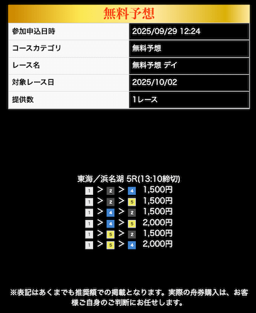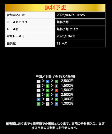 ★☆☆☆☆ 1.02025/10/02登録直後は感じが良かったけど、途中から「このレースは特別情報です」とか言って5万円以上する情報を勧めてくる。安いプランは全然当たらないし、結局高いコースに誘導される仕組み。
