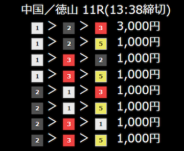 | 10月5日 | 徳山11R | 三連単 | 10,800円 | |