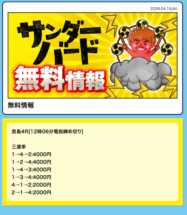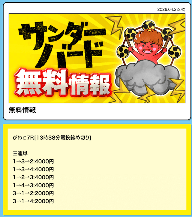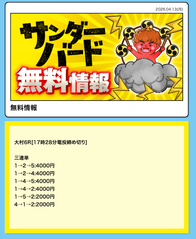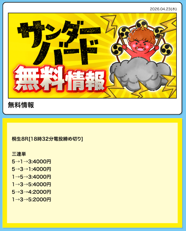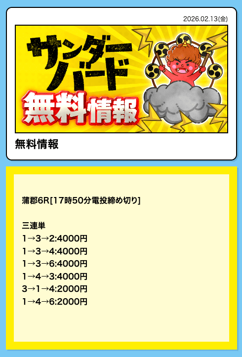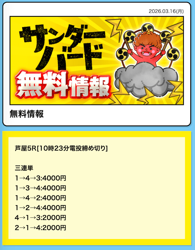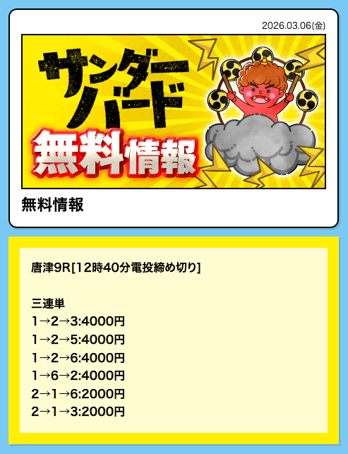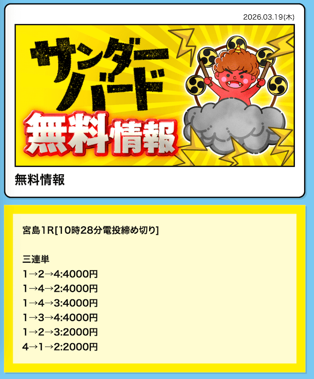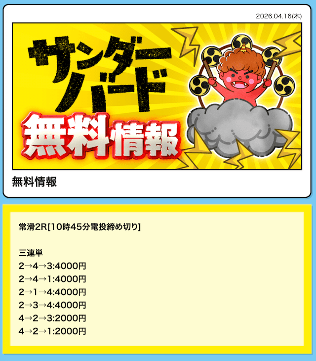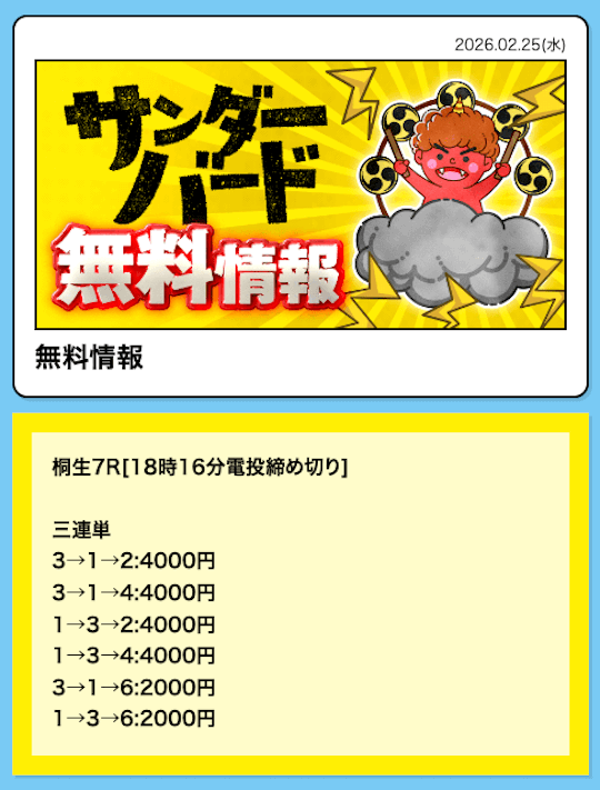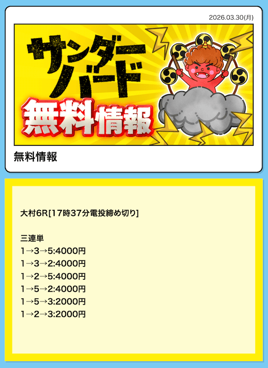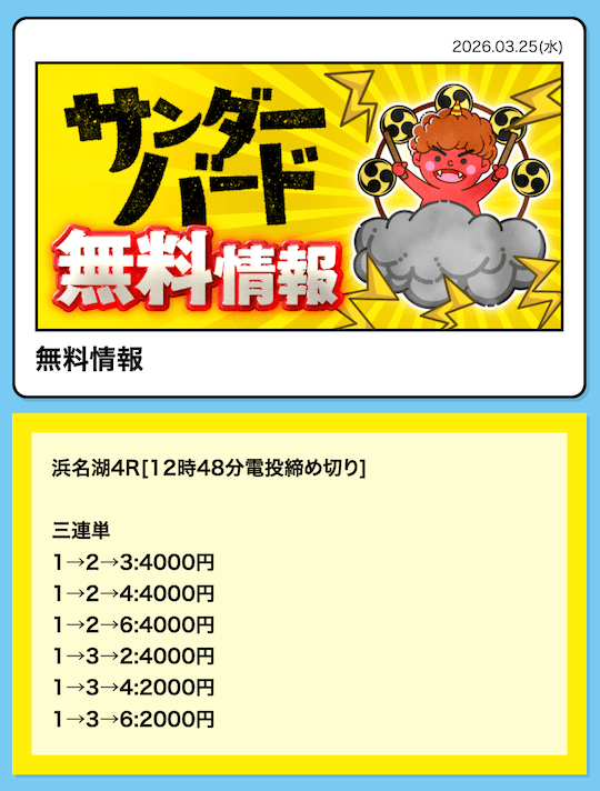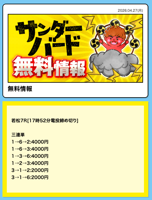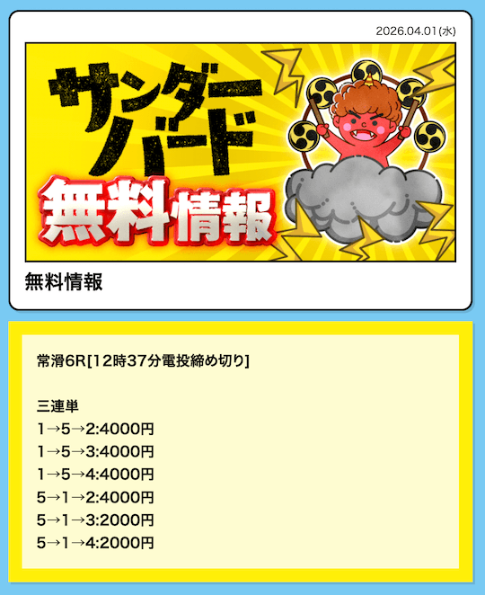 - Q1無料予想は毎日提供ですか?A競艇サンダーバードの無料予想は「月・木・金・土・日」の毎週5日間の提供となっています。火曜・水曜は残念ながら提供されないので、ご注意ください。