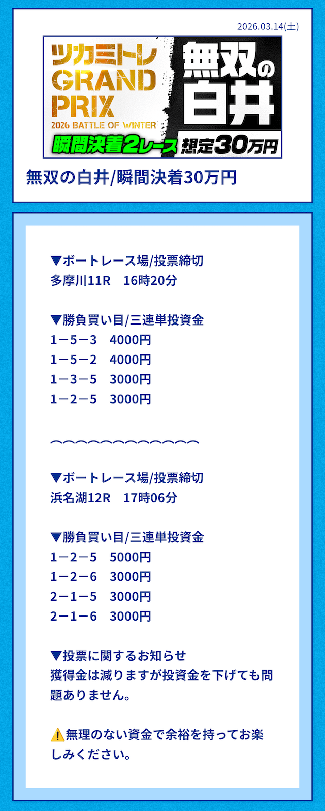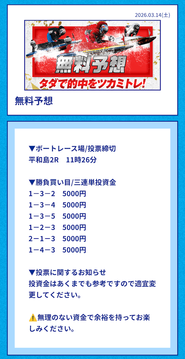 ’26/03/14 的中無料予想で76,000円獲得