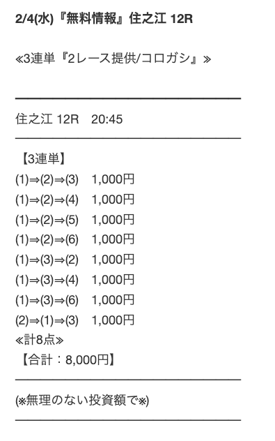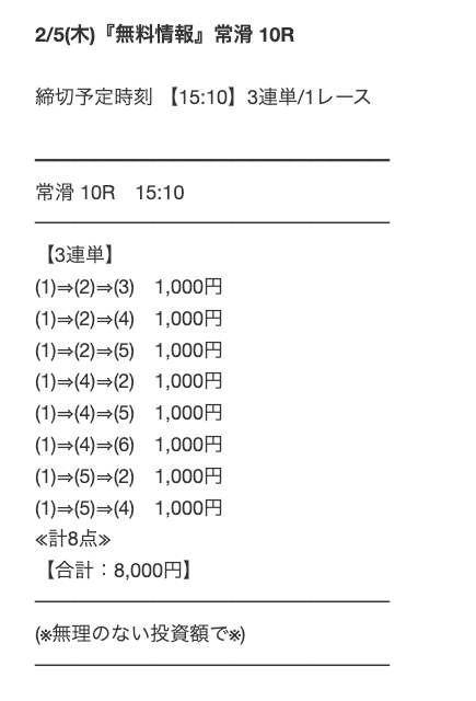 ★★★☆☆ 3.02018/03/07無料はこの3日間で4レース中2レース的中しました