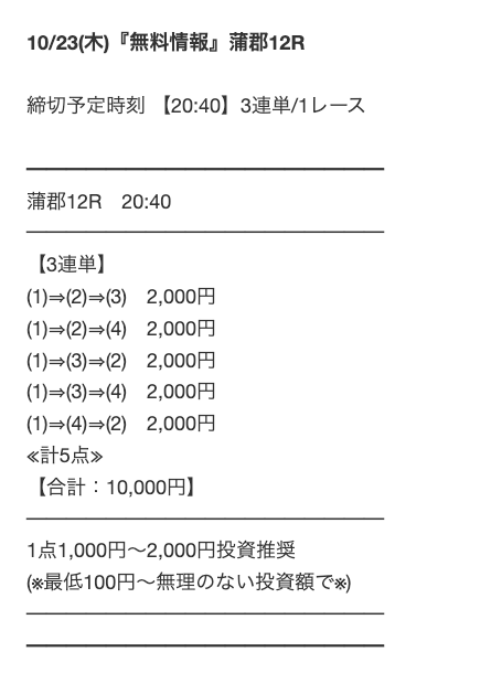 ’24/10/23 的中無料予想で83,000円獲得