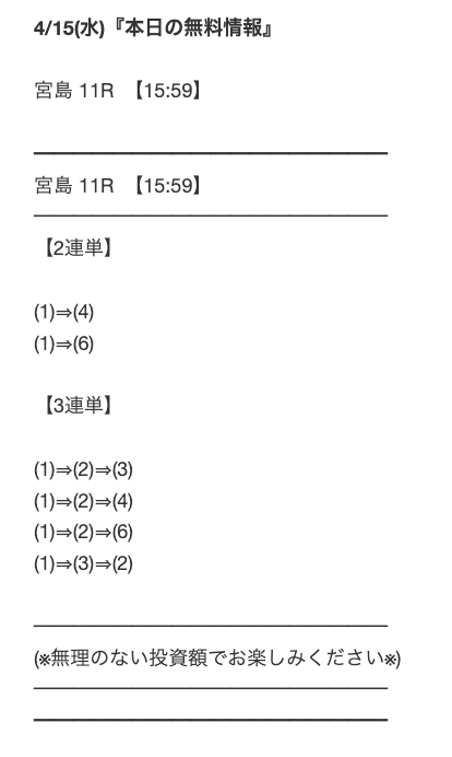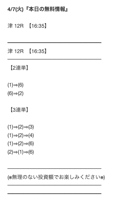 ★★★☆☆ 3.02018/03/07無料はこの3日間で4レース中2レース的中しました