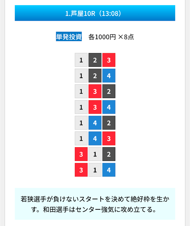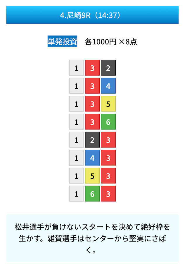 - Q3無料予想はいくらで勝負すべき?AZONEの推奨通り、1点1,000円の8,000円投資をすれば、ムサシ屋の実績と同じレベルで稼げるでしょう。一方で、より大きく稼ぎたい方は投資金額を2倍にして勝負するのがおすすめ!高い的中率を担保したまま、的中時に稼げる金額を最大化させることができます。